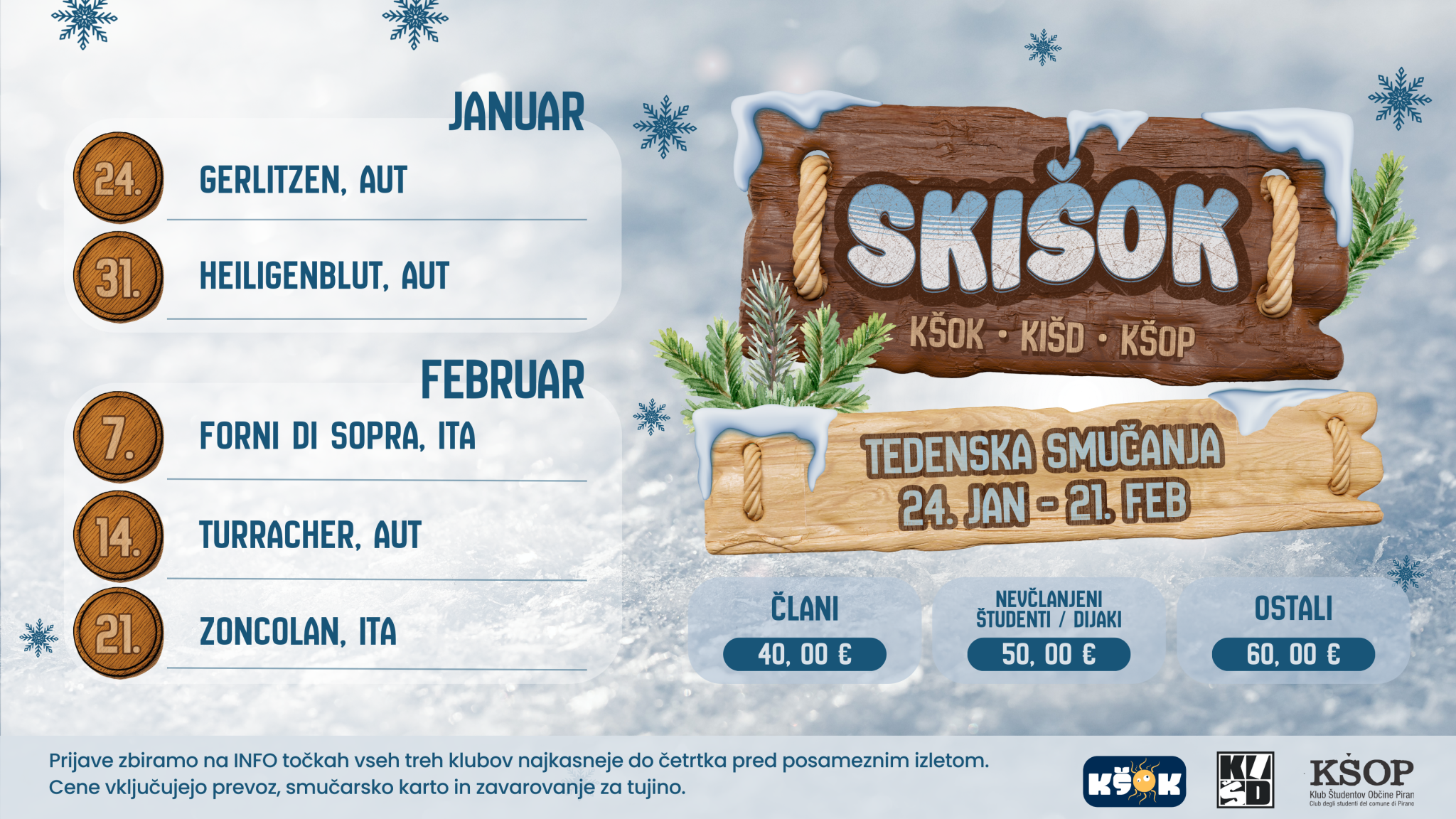 Hej, sporočamo ti, da so odprte prijave na prvo smučanje v sklopu SKIŠOK-a. Če te danes ni bilo na info točki, brez skrbi. V četrtek, 22. 1. je info točka znova odprta od 16.00 do 18.00, kjer se lahko prijaviš na sobotno smučanje. Cene:– Člani: 40,00 €– Simpatizerji: 50,00 €–…